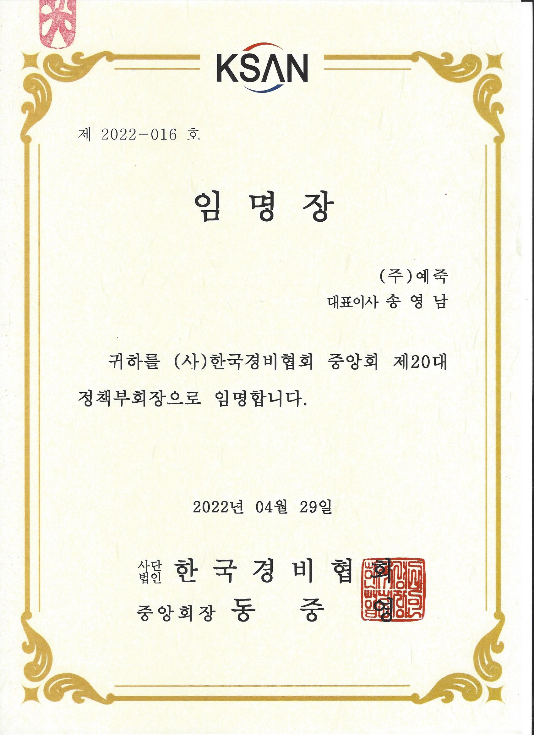 정책 부회장 임명장(사)한국경비협회